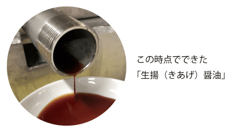 約1年間(商品によっては2年間)熟成させながらもろみを(濾布)で包み重ね、上から圧をかけて絞ります。圧搾して出てきた液体が「生揚(きあげ)醤油」となります。